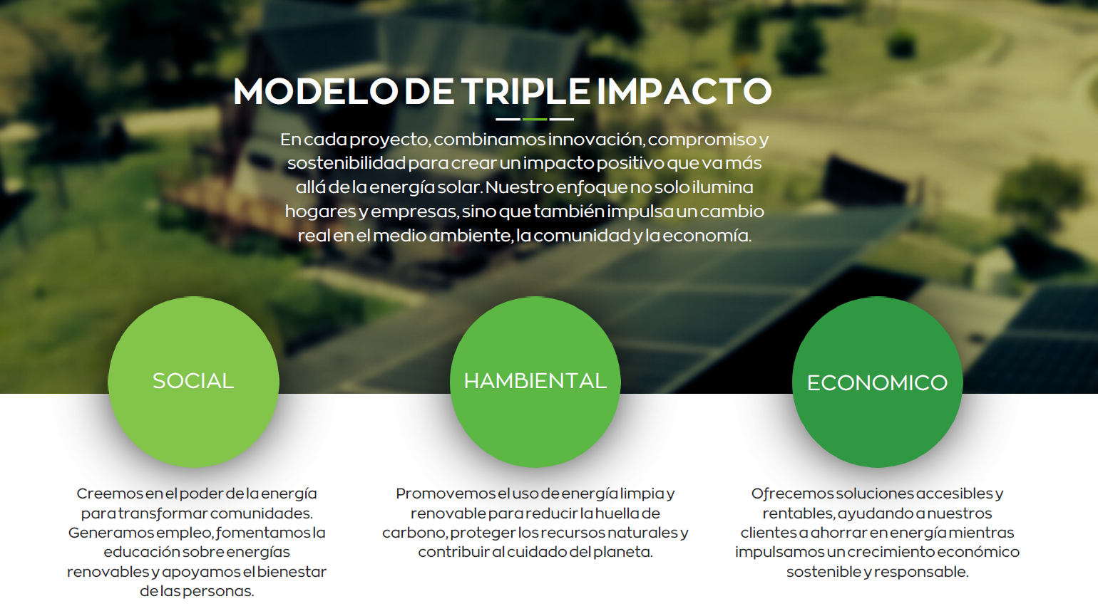 MISIÓNQueremos ser líderes en el concepto de tripleimpacto: generar beneficios económicos,sociales y ambientales. EnergíasAlternativas no es solo un negocio de ventade insumos; es una apuesta por un futuromejor para todos. Creemos firmemente enhacer la transformación hacia un estilo devida sustentable lo más simple y accesibleposible, para que juntos logremos un mundomás consciente y responsable.
